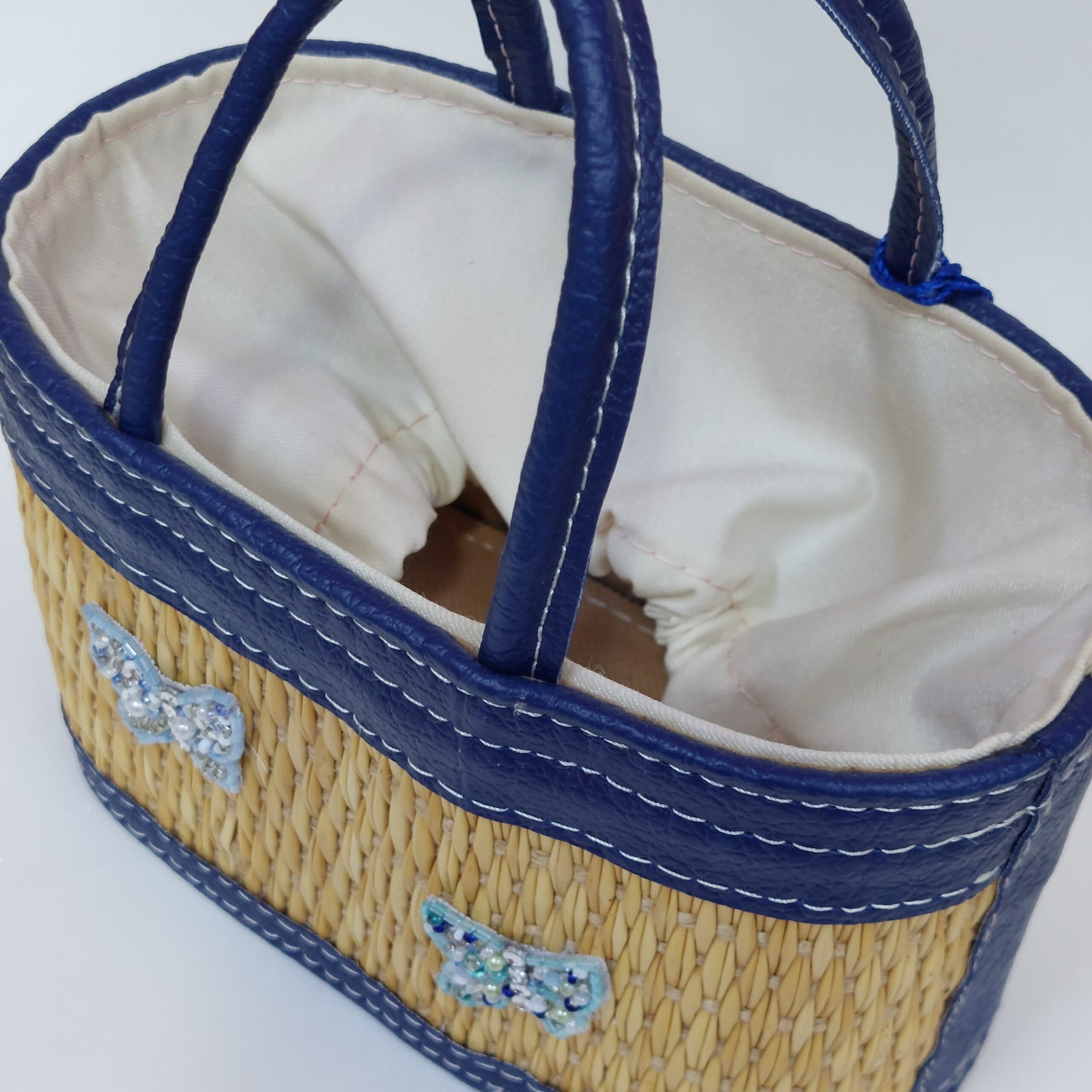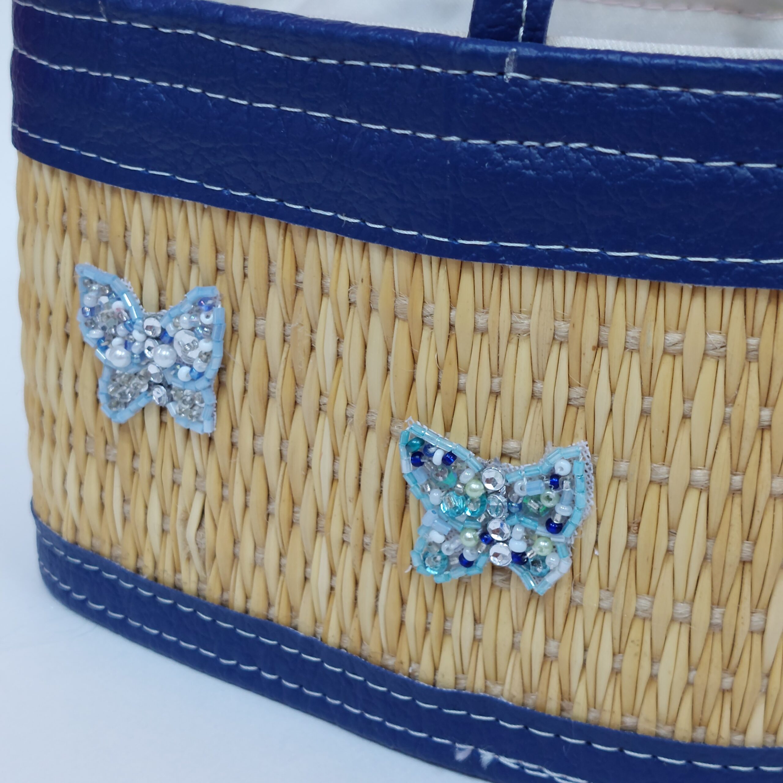 Fabriqué à partir de fibre de jonc naturelle de haute qualité, chaque couffin est décoré à la main avec des motifs en perles et en strass pour ajouter une touche de brillance et d’élégance.
