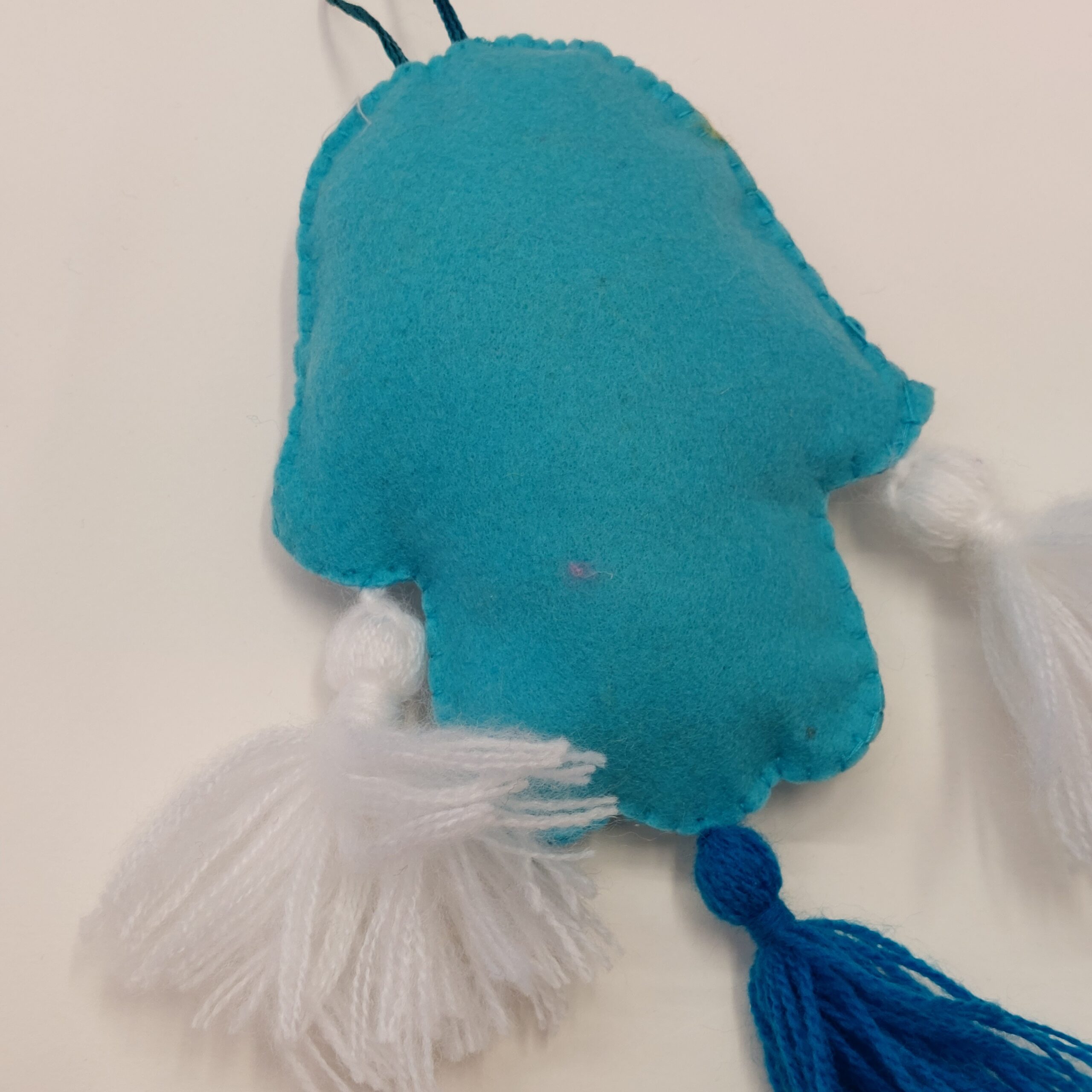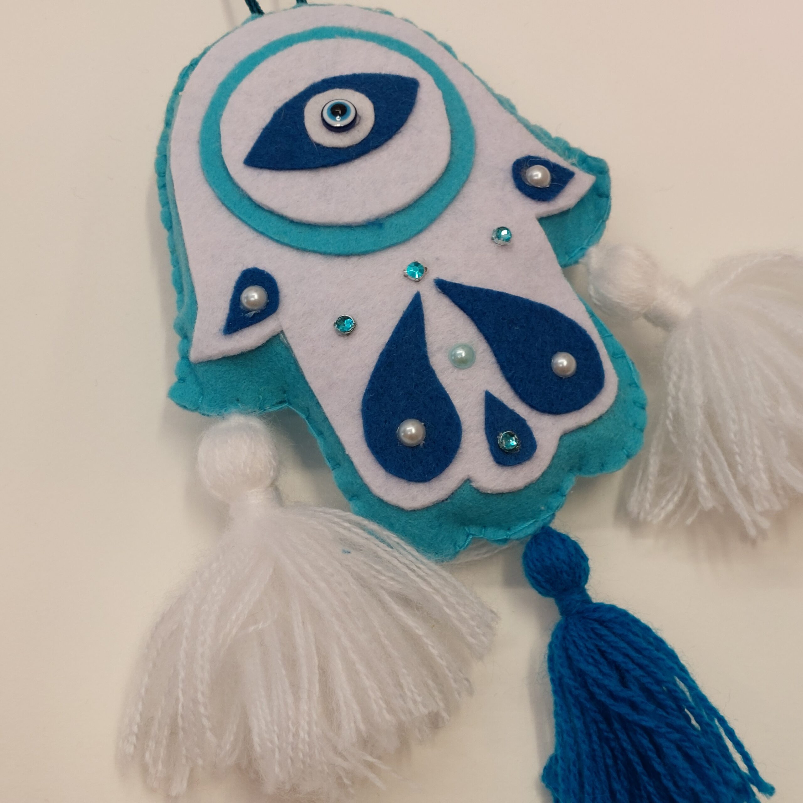 Ajoutez une touche de couleur et de bonne humeur à votre quotidien avec ce porte-clé Khomsa en feutrine bleu et blanc conçu à la main.