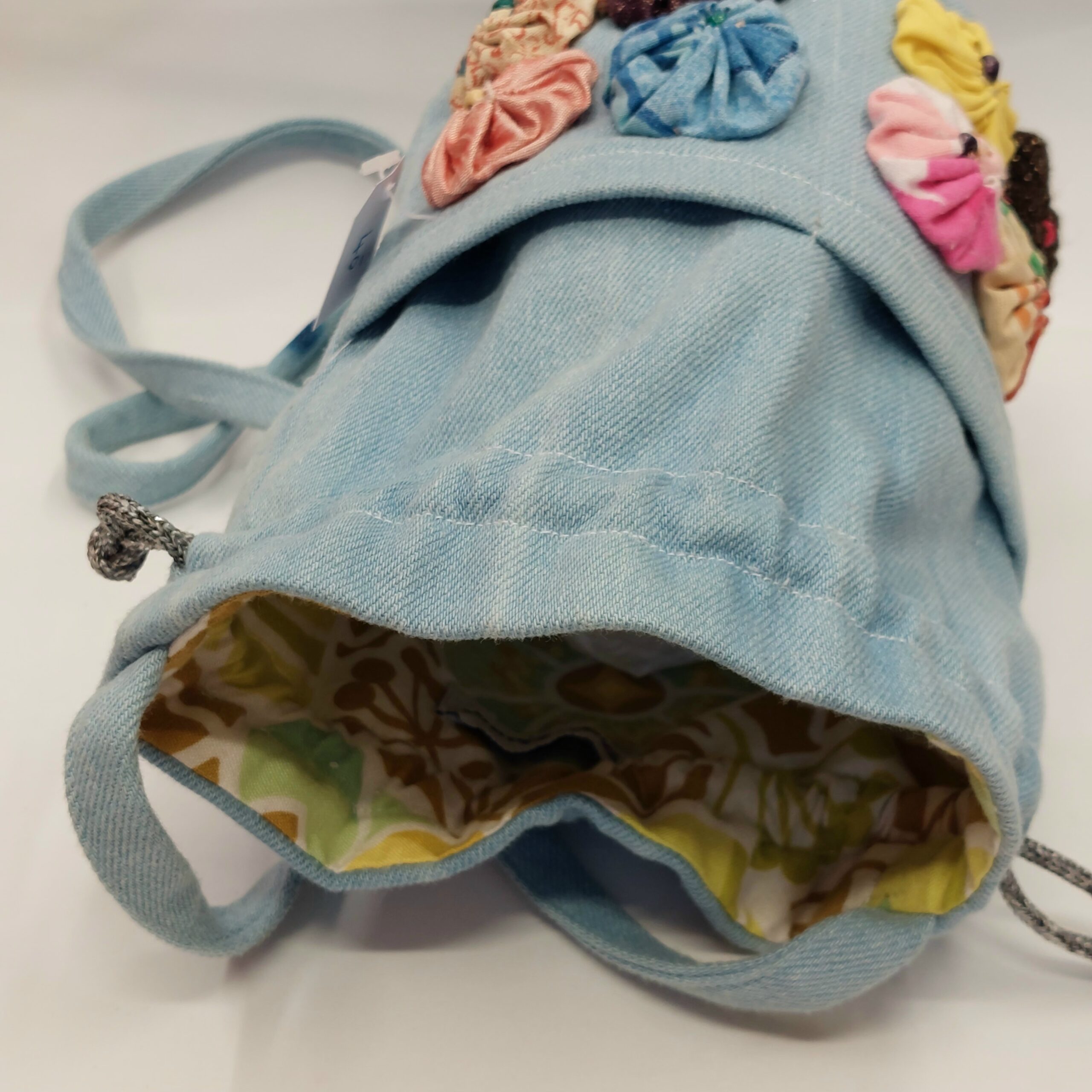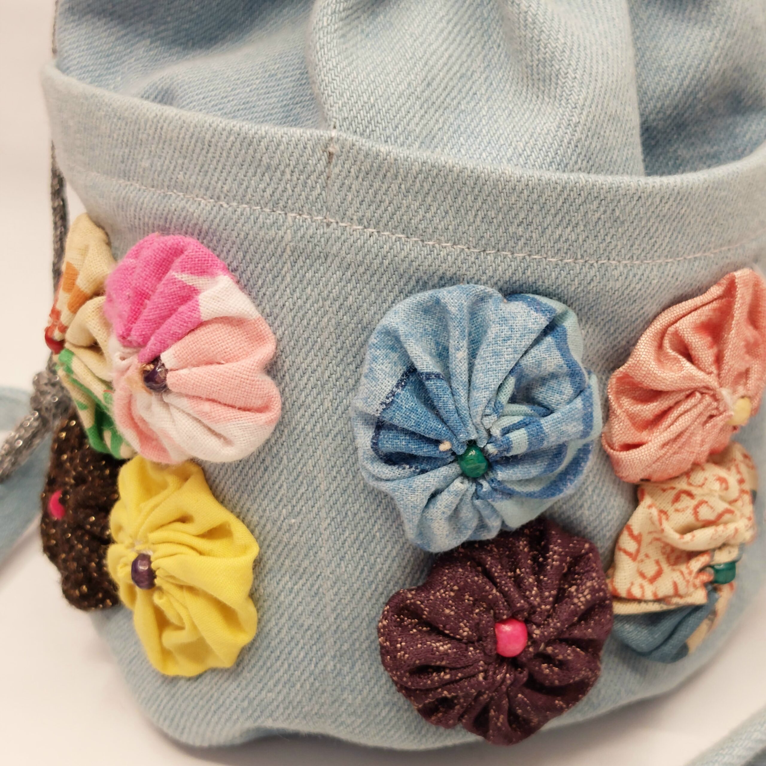 Le sac est décoré avec des fleurs rembourrées en tissus imprimés et des petites boules en bois